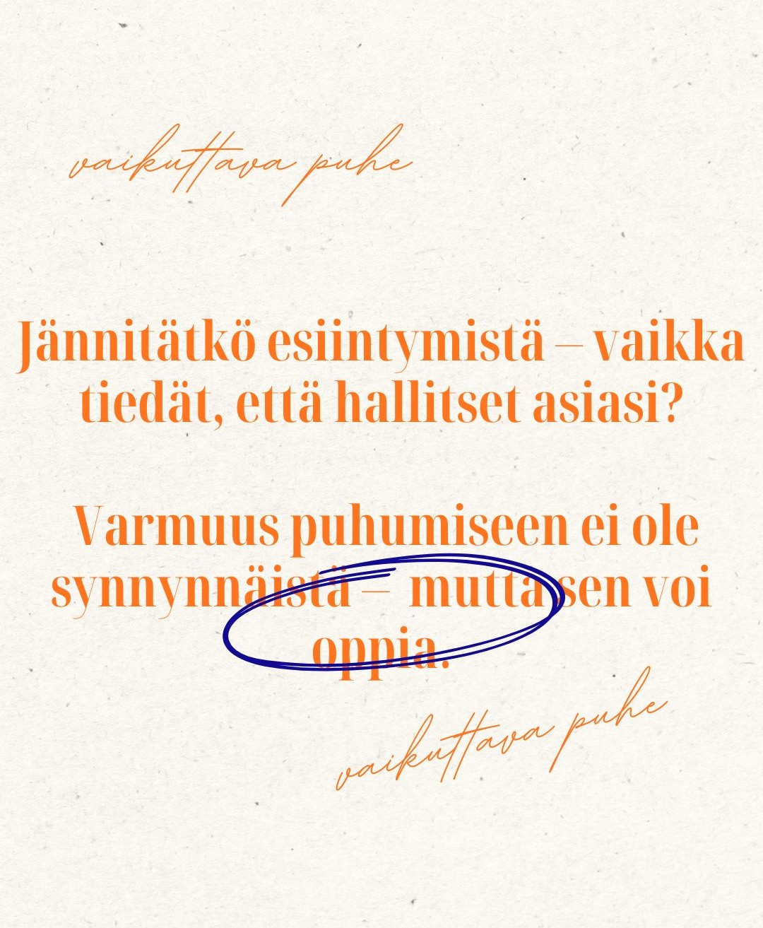 Mutta olen oppinut että puhumistaitoja voi oppia ja niitä täytyy harjoitella säännöllisesti. Olen päässyt työurallani eteenpäin ymmärtämällä miten suuri merkitys vaikuttavalla puhumisella ja neuvottelutaidoilla on. Vaikuttava puhe on osa kaikkea kanssakäymistä työelämässä ja arkipäivän elämässä.